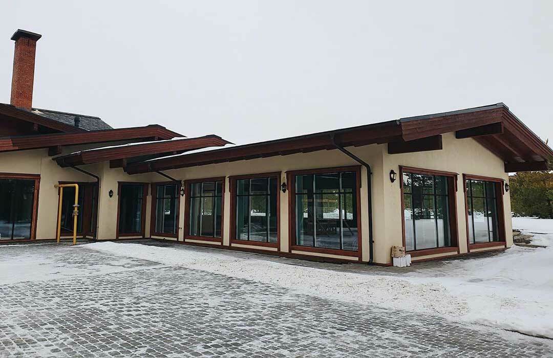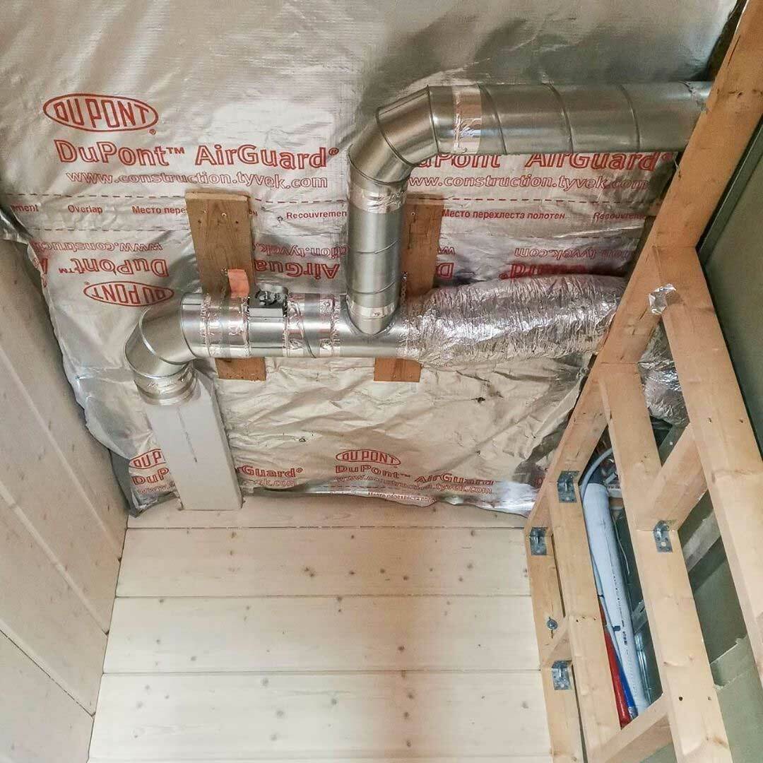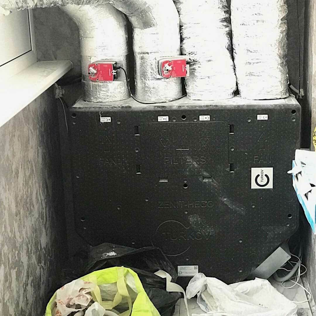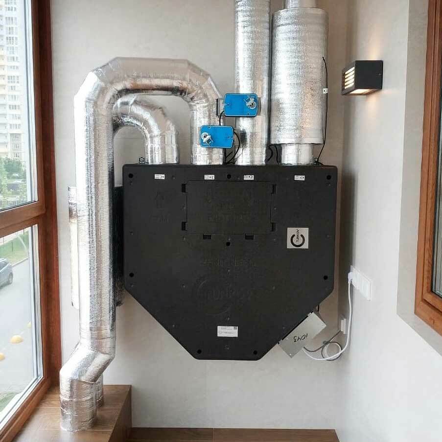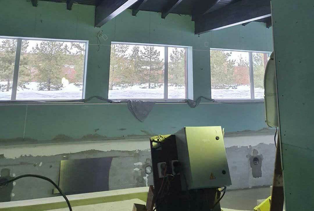 Окна по периметру бассейна занимают около 60-70% всего пространства. Приточный воздух подается вдоль окон снизу вверх, причем подается двумя путями: щелевыми решетками и конвекторами, которые работают с диаметральными вентиляторами без подмеса наружного воздуха. Объем помещения 1000 м³, вентиляционная установка рассчитана на 6000 м³, что образует шестикратный обмен объема воздуха. Данное решение применимо потому что бассейн отапливается только тепловым насосом и конвекторами.