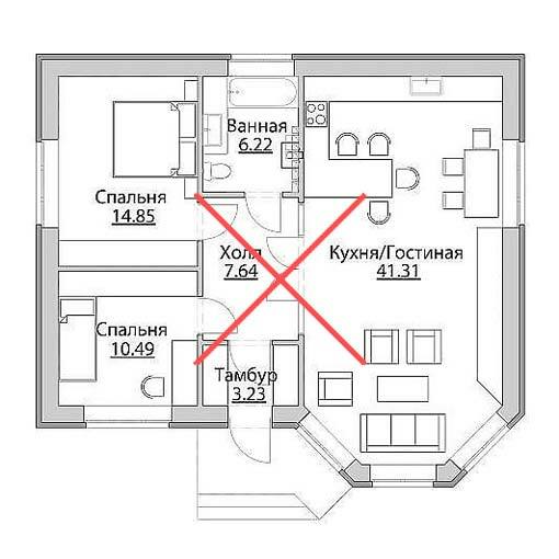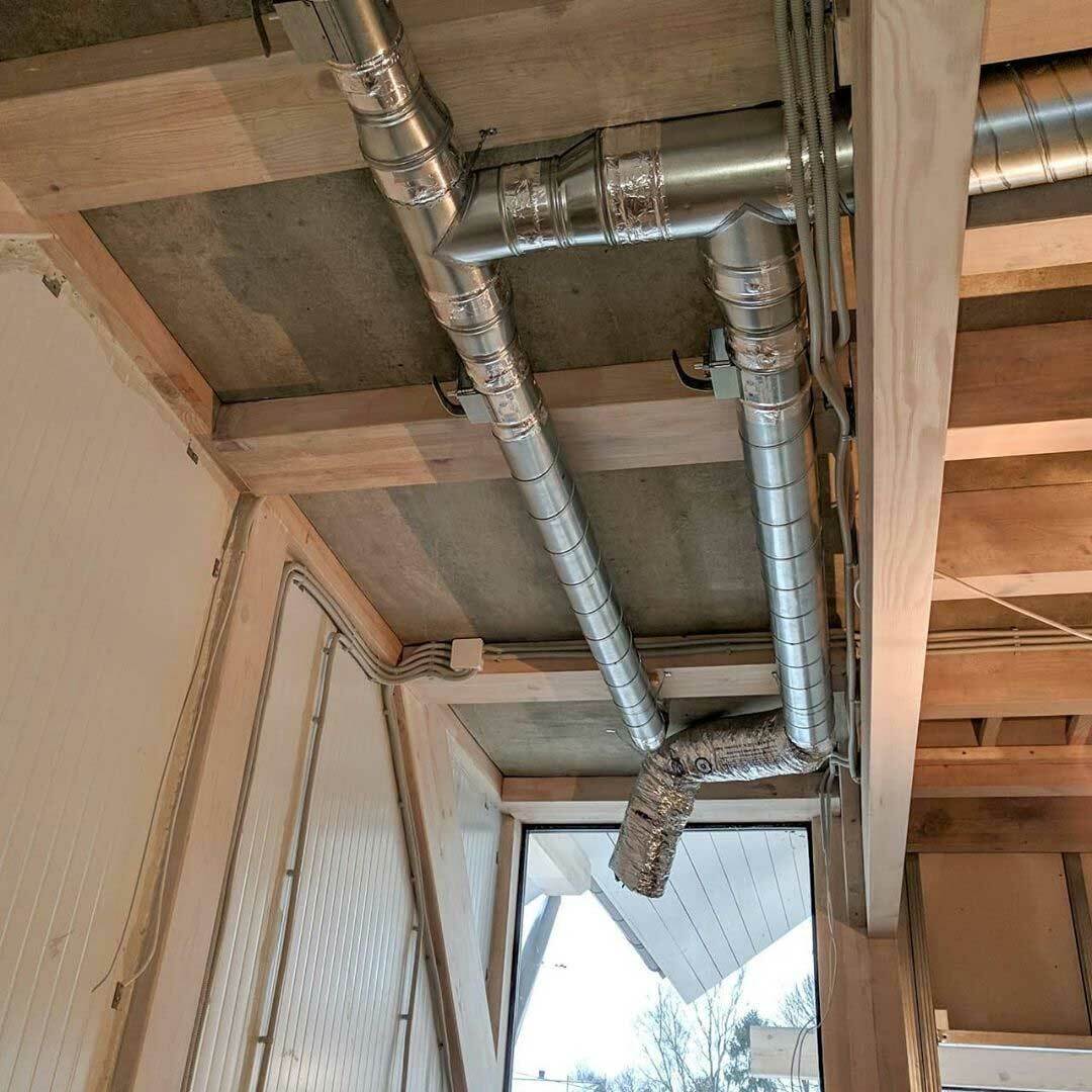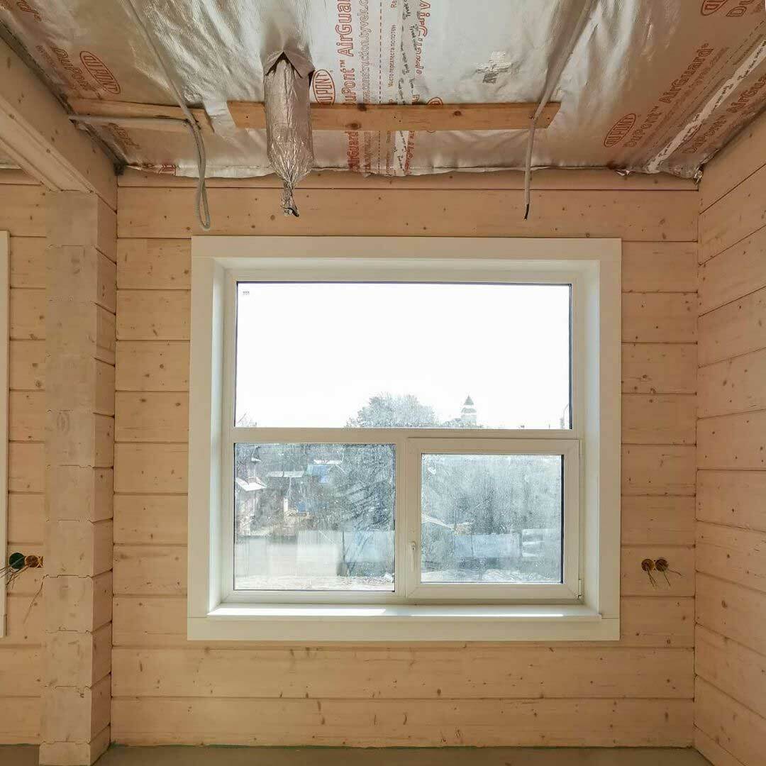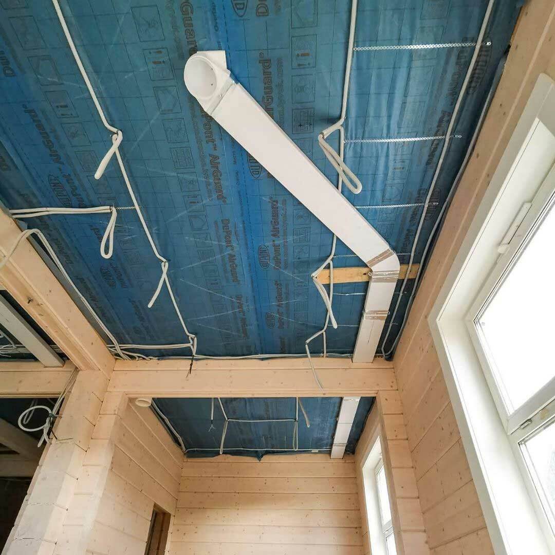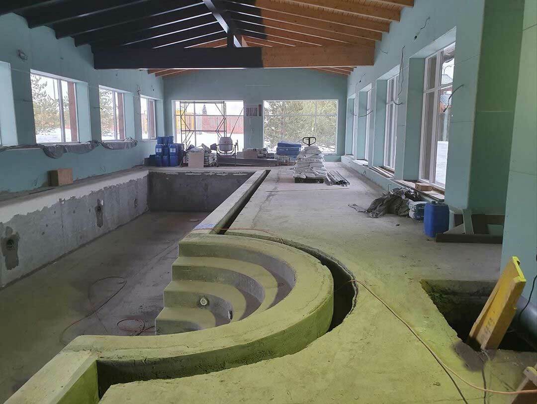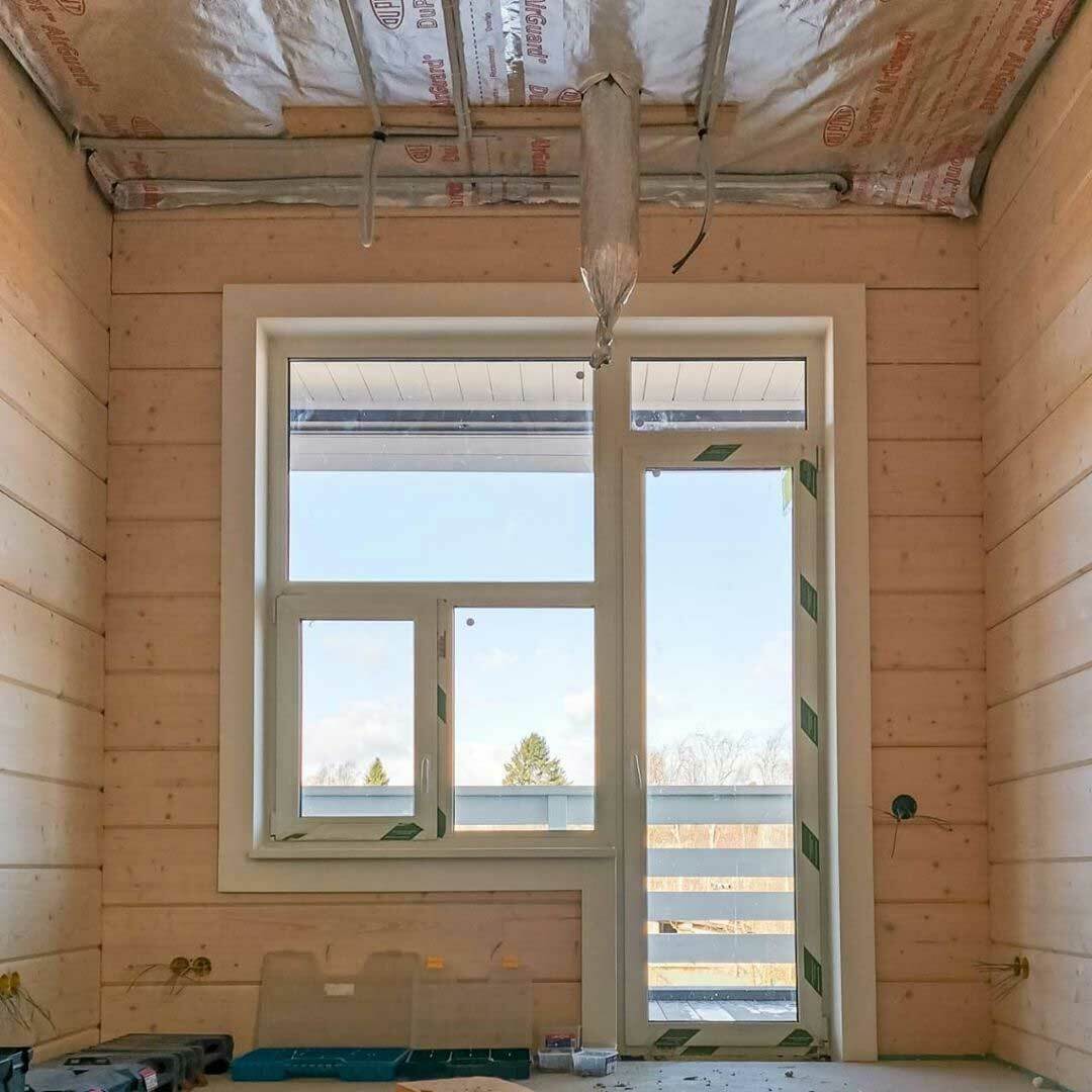 Окна по периметру бассейна занимают около 60-70% всего пространства. Приточный воздух подается вдоль окон снизу вверх, причем подается двумя путями: щелевыми решетками и конвекторами, которые работают с диаметральными вентиляторами без подмеса наружного воздуха. Объем помещения 1000 м³, вентиляционная установка рассчитана на 6000 м³, что образует шестикратный обмен объема воздуха. Данное решение применимо потому что бассейн отапливается только тепловым насосом и конвекторами.